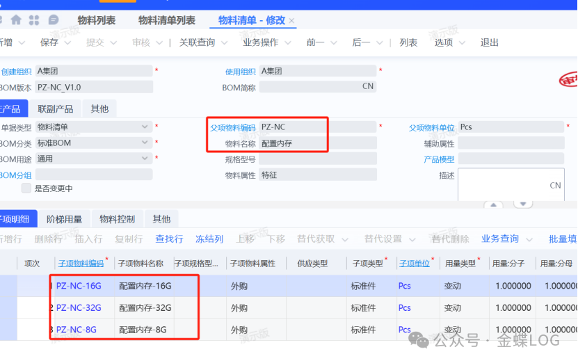第四步:给【特征】类料号创建BOM 打开物料清单列表,新增一个BOM,父项物料编码选择一下特征属性对应料号(第二步料号),这里选了配置内存。明细页签的的子项物料编码则是实际的规格内存料号,也就是我们第三步创建的。