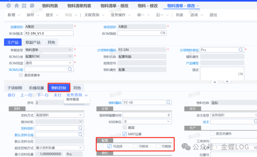K 额外扩展 在第五步里,我们实际上可以对物料进行配置属性的勾选,一共有三种【可选择】、【可修改】、【可替换】