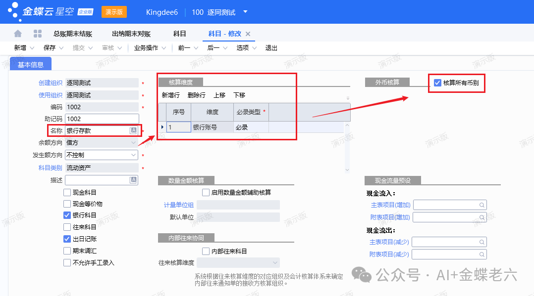 二、核心基础数据设置1.科目设置,针对银行存款带核算维度的科目设置如下图所示: