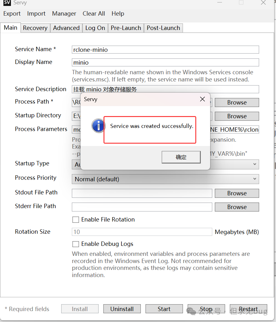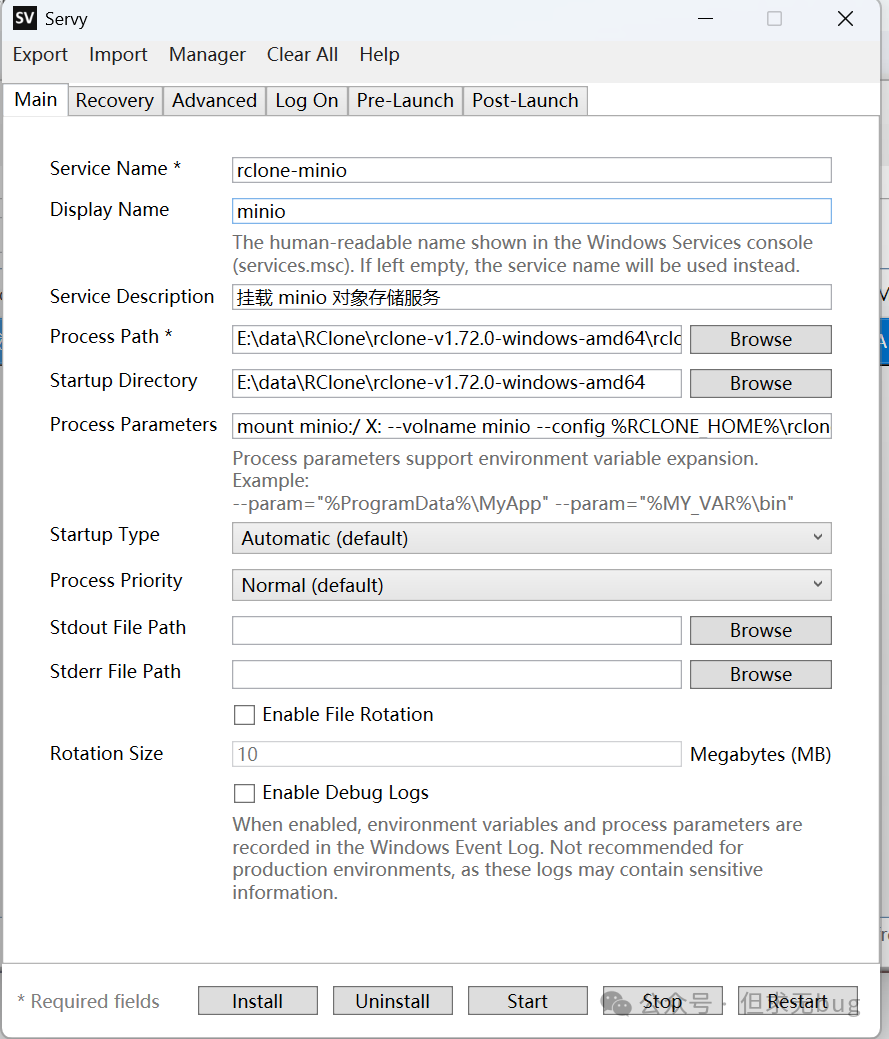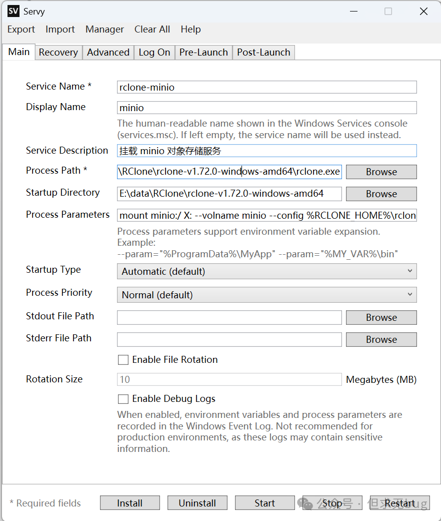 在 Servy 中填写 RClone 挂载程序的结果如下所示: