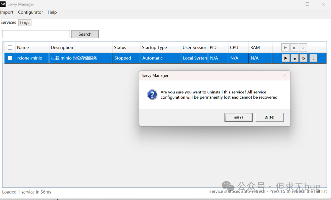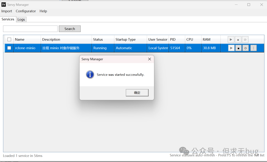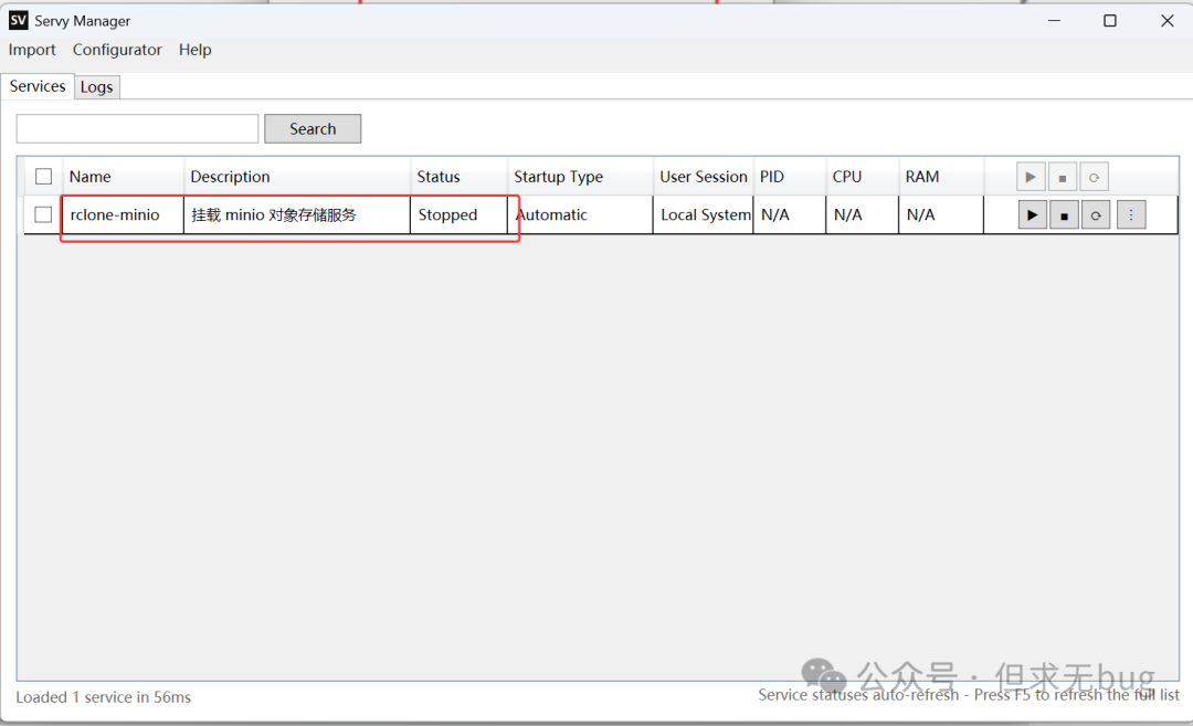 此时在打开的 Servy Manager 中按 F5 键刷新便能看到注册的 rclone-minio 服务: