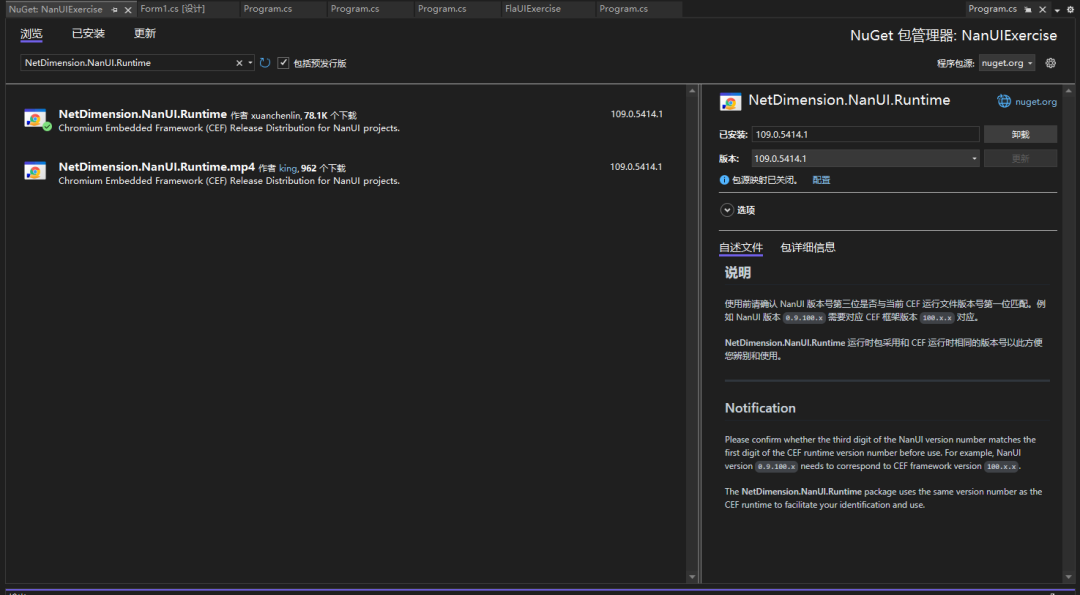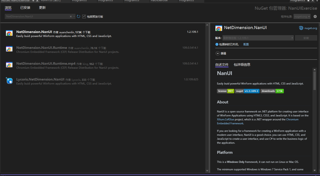 安装 NanUI 所依赖的 Chromium Embedded Framework 依赖包 NetDimension.NanUI.Runtime