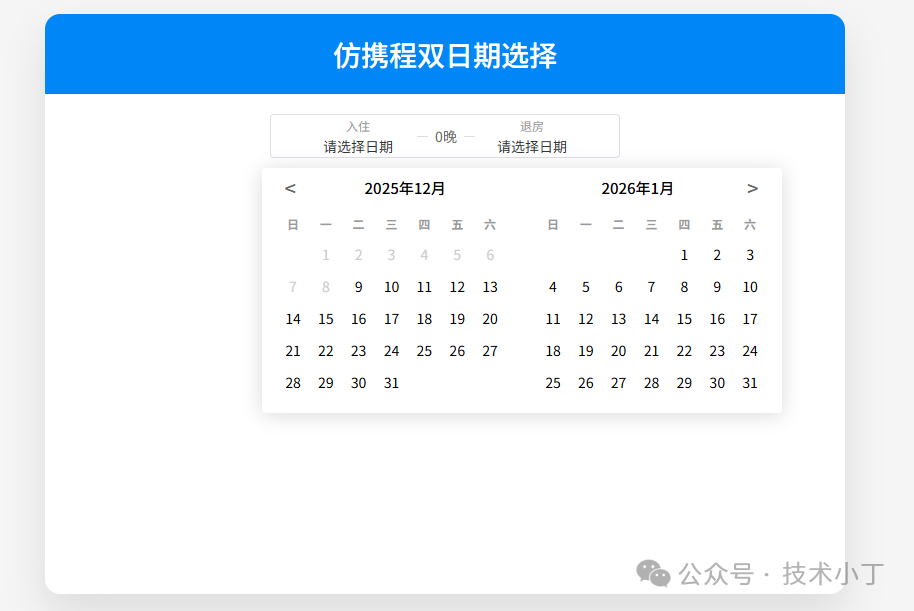 table td:hover:not(.disabled):not(.old):not(.new) {          background#4daaf8;          color#fff;      }  </style></head><body><div class="container">  <div class="header">    <h1>仿携程双日期选择</h1>  </div>  <div class="main">    <div class="date-bar" id="dateBar">      <div class="item">        <div class="label">入住</div>        <div class="val" id="checkInStr">请选择日期</div>      </div>      <div class="val" id="nightCount">0晚</div>      <div class="item">        <div class="label">退房</div>        <div class="val" id="checkOutStr">请选择日期</div>      </div>    </div>    <div class="modal-wrap" id="calendarWrap">      <div class="modal-bd" id="calendarBox"></div>    </div>  </div></div>