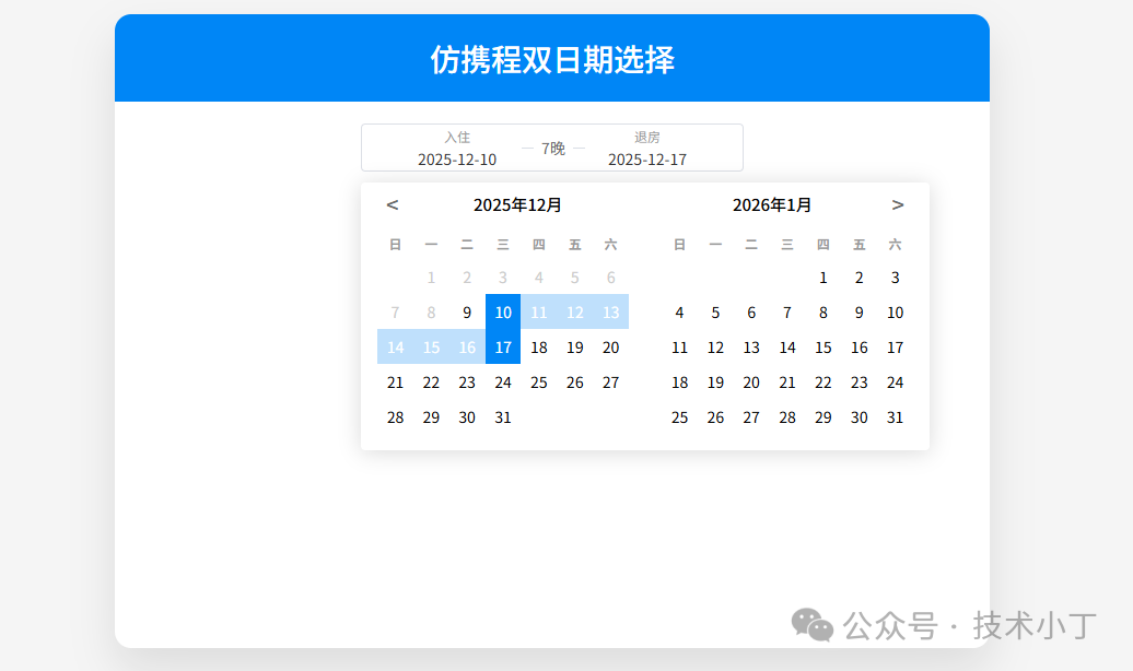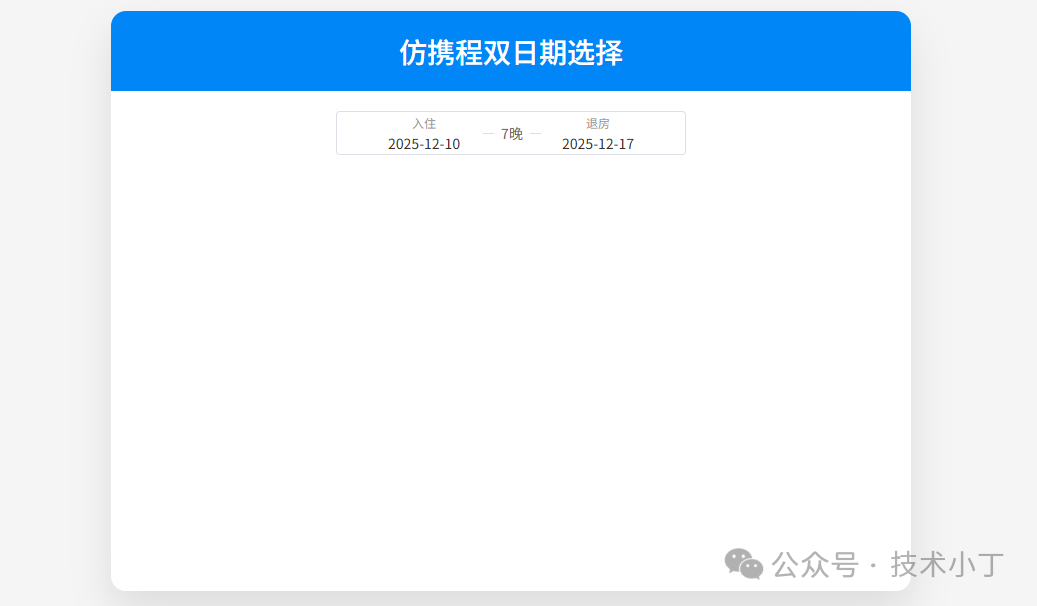 <!doctype html><html lang="zh-CN"><head>  <meta charset="utf-8">  <title>仿携程双日期选择</title>  <meta name="viewport" content="width=device-width,initial-scale=1">  <style>      * {          margin0;          padding0;          box-sizing: border-box;      }      body {          background#f5f5f5;          min-height100vh;          padding20px;      }      .container {          max-width800px;          margin0 auto;          background: white;          border-radius15px;          box-shadow0 20px 40px rgba(0,0,0,0.1);          overflow: hidden;      }