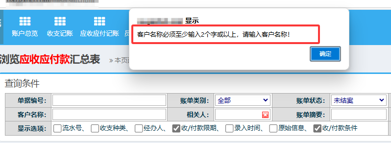 财务记账管理模块里面,这个可以显示全部记账内容吗?现在需要提供客户名称中的至少两个文字作为查询条件 ​有一个权限控制码,没有查询全部客户的权限时,就必须输入客户名称作为条件。因为可能有多个做账人员,或者公司不希望做账人员看到所有历史数据,所以默认情况下,做账人员只能看到部分数据,不允许看到完整数据。