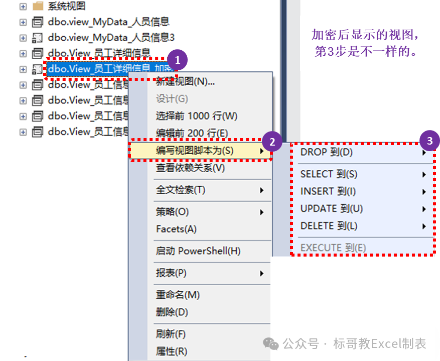 在SQLServer中为了防止我们的代码被人非法剽窃,可以加一个密码。今天讲解怎么对视图的Select进行加密处理。一、加密注意事项查询加密视图与查询普通视图操作方法没有区别。任何拥有最高权限的人都无法查看源代码。如果以后要改逻辑,必须用未加密的源代码,否则只能删了重新设置。二、语法CREATEVIEW<视图的名称>W...