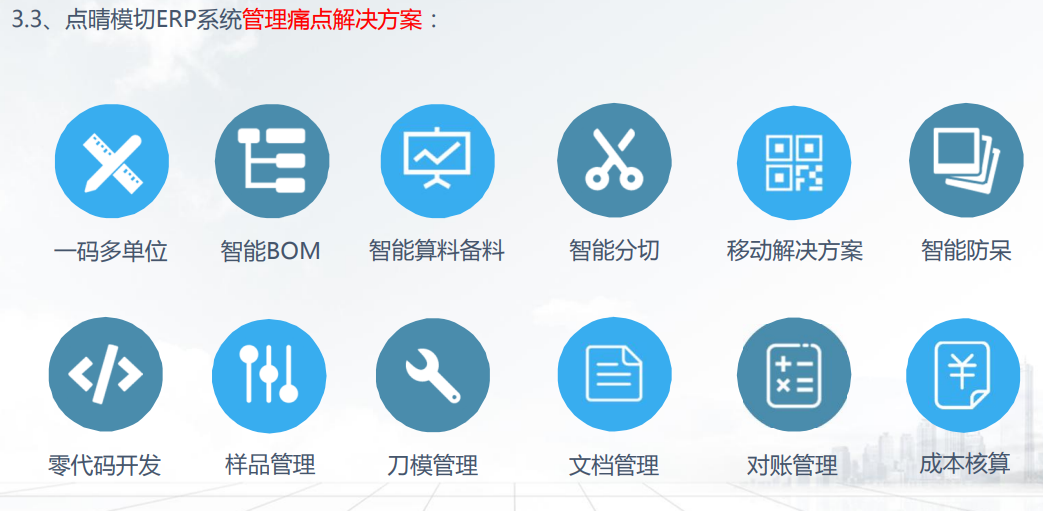 其实不管是模切行业还是其他行业,生产管理都是一大难题,有的企业不断投入更大的人力和财力,依然没能改善问题。通过应用点晴模切ERP系统,就可以实现闭环式生产管理流程,既能够提高整体的效率和品质,而且也能帮助模切其他完美解决管理上的痛点问题。其功能特色有以下几个:一码多单位:可以智能识别可替用物料,合理安排分切计划和生产计划,精确计算物料需求量,根据缺料情况自动形成申购单,解决了后续原材料管理失控。智能BOM:可以智能识别可替用物料,合理安排分切计划和生产计划,精确计算物料需求量,根据缺料情况自动形成申购单,解决了后续原材料管理失控。智能算料备料:实现了仓库物料自动锁定订单、自动形成分切计划、多订单合单共用料、呆滞物料优先使用,可有效帮助PMC 排产/ 备料/ 申购,有效降低呆滞料的产生。智能分切:实现了分切料自动继承原始母料的基础属性,通过智能BOM 的应用,实现生产备料时系统自动推荐物料或可用替代料。智能防呆:系统预设原材料保质期到期提前提醒,实时关注材料保质期状况,防止模切企业造成过量采购、分切尾料过多、发错材料、材料过期等情况发生。