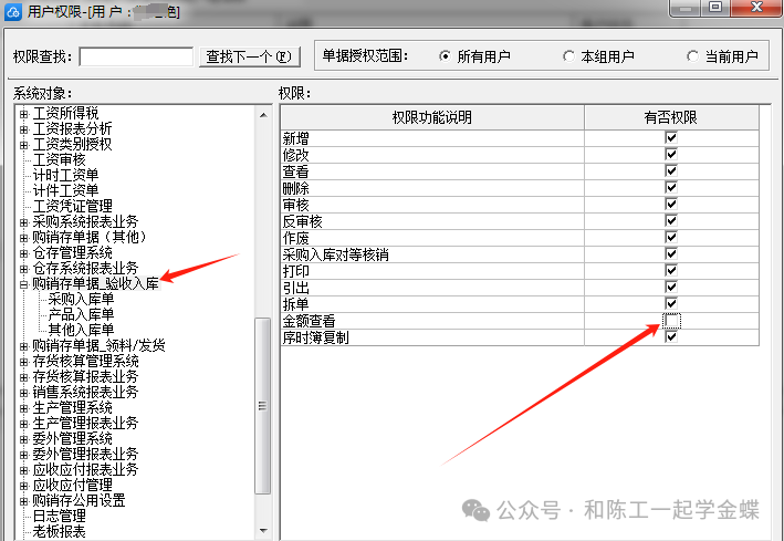 其实这只是你以为的取消而已,其实我们需要在上面的购销存单据-验收入库里面也要取消,你只取消它下面的,不取消它自己,那是没用的,应该在这里也要取消,这个问题是特别多客户问到的,就算把下面的采购入库产品入库其它入库全部取消,只要上面的购销存单据-验收入库没取消,他还是会拥有所有的权限。 ![]() ![]()