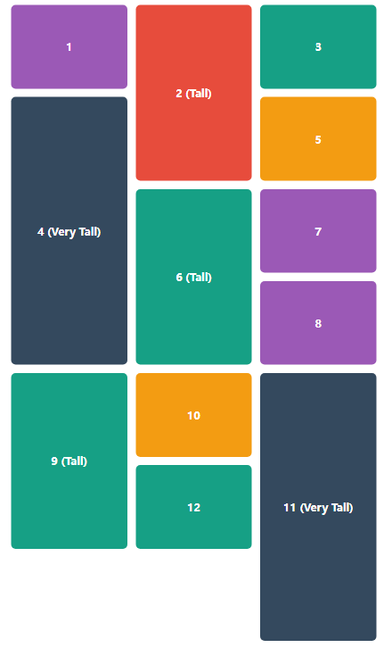 /* 随机颜色,仅用于演示 */        .item:nth-child(3n) {            background-color#16a085;        }        .item:nth-child(5n) {            background-color#f39c12;        }    </style>    <div class="container">        <div class="item">1</div>        <div class="item tall">2 (Tall)</div>        <div class="item">3</div>        <div class="item very-tall">4 (Very Tall)</div>        <div class="item">5</div>        <div class="item tall">6 (Tall)</div>        <div class="item">7</div>        <div class="item">8</div>        <div class="item tall">9 (Tall)</div>        <div class="item">10</div>        <div class="item very-tall">11 (Very Tall)</div>        <div class="item">12</div>    </div>
