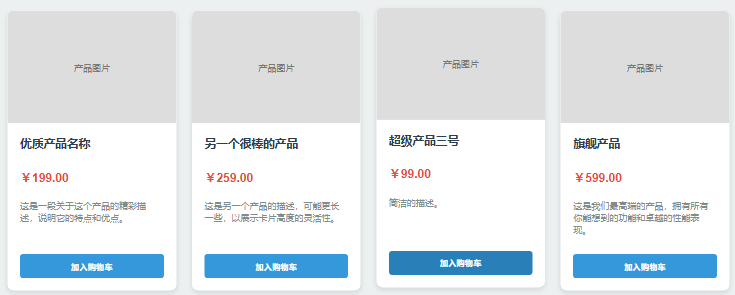 <!-- 复制更多卡片以查看网格效果 -->        <div class="product-card">            <div class="product-image">产品图片</div>            <div class="product-info">                <h3 class="product-title">另一个很棒的产品</h3>                <p class="product-price">¥259.00</p>                <p class="product-description">这是另一个产品的描述,可能更长一些,以展示卡片高度的灵活性。</p>                <button class="add-to-cart-btn">加入购物车</button>            </div>        </div>