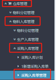 :点晴ERP-采购入库单管理教程![]() 1.进入ERP系统后,在上方或者左侧点击“仓库管理”》“物料入库管理“》“采购入库管理”》”采购入库单管理“。