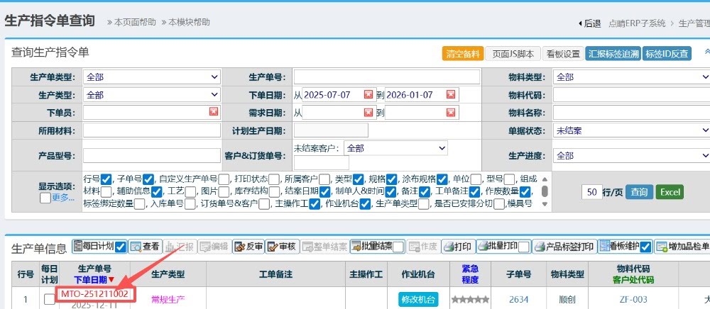 点晴模切ERP如何通过工单号查询到领料清单以及对应批次
