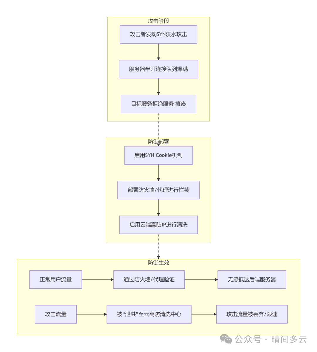 “游戏掉线,排位十连跪” “电商大促,订单页打不开,老板暴走” 04 别慌!4 招保命 ① SYN Cookie(免费神技) Linux 一句话: sysctl -w net.ipv4.tcp_syncookies=1 不分配内存先算账,ACK 对得上再开门。 ② 防火墙“代握手” 让防火墙先扛三次握手,后端只看成功连接,攻击流量直接隔离。 ③ 限速 + 首包丢弃 同一IP 1 秒>100 个 SYN?直接丢;再观察会不会重传,变态流量现原形。 ④ 上云高防 阿里云/腾讯云/Cloudflare 全球清洗中心,2000G 带宽当“泄洪区”,源站安心睡大觉。 05 企业级 checklist(收藏)