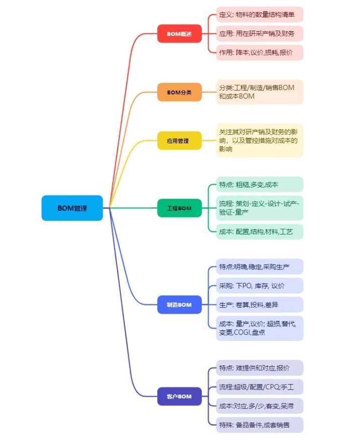 总体来讲,本文前面着重讲述了BOM概述、分类、应用及管理等,希望能给同行一定的帮助和借鉴。强调一下,工程BOM决定着物料成本,需要严抓研发降本;制造BOM关联着实际消耗,需要管控投料异常;客户BOM影响着报价准确,需要做好报价和客变管理等。另外,不同行业和公司及场景,有着不同的情况,需具体问题具体分析。本文仅做为参考,希望自己的经历和思考能给大家带来帮助。请求同存异,不喜勿喷。谢谢。