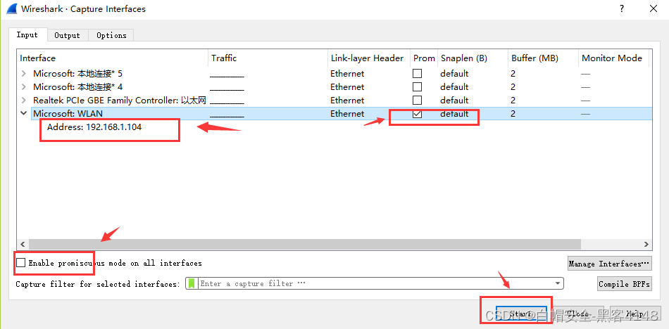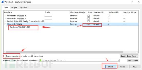 选择菜单栏中的 Capture → Option,勾选 WLAN 网卡(根据各自电脑网卡使用情况选择,可参考 IP 对应的网卡)。点击 Start 启动抓包。