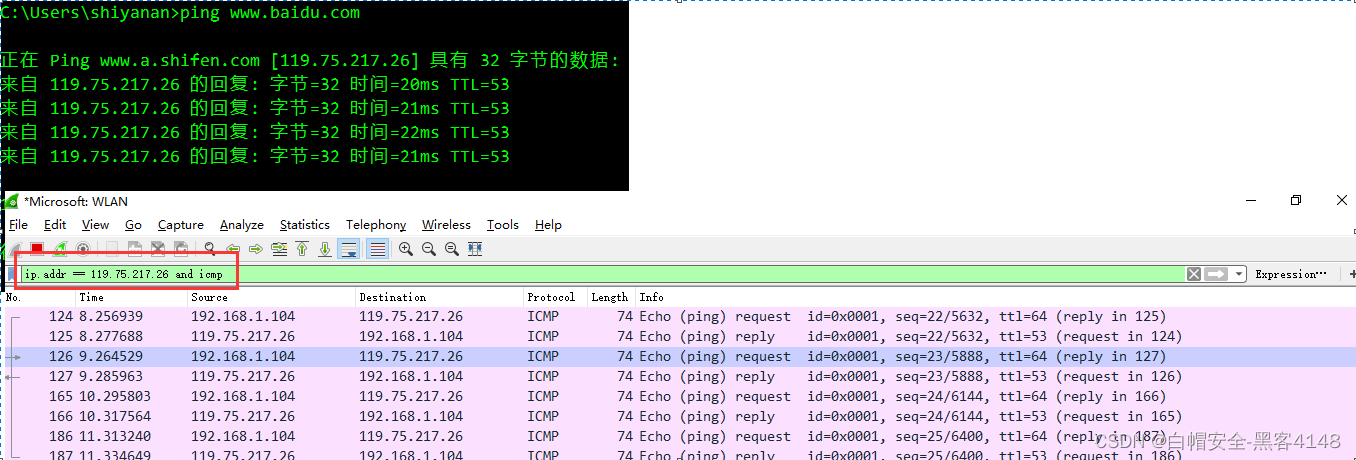 执行需要抓包的操作,例如在命令提示符窗口下执行 ping www.baidu.com。