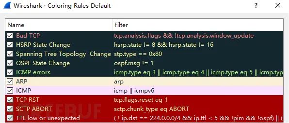 说明:数据包列表区中,不同协议使用不同颜色区分。协议颜色标识可在菜单栏 View → Coloring Rules 中设置。
