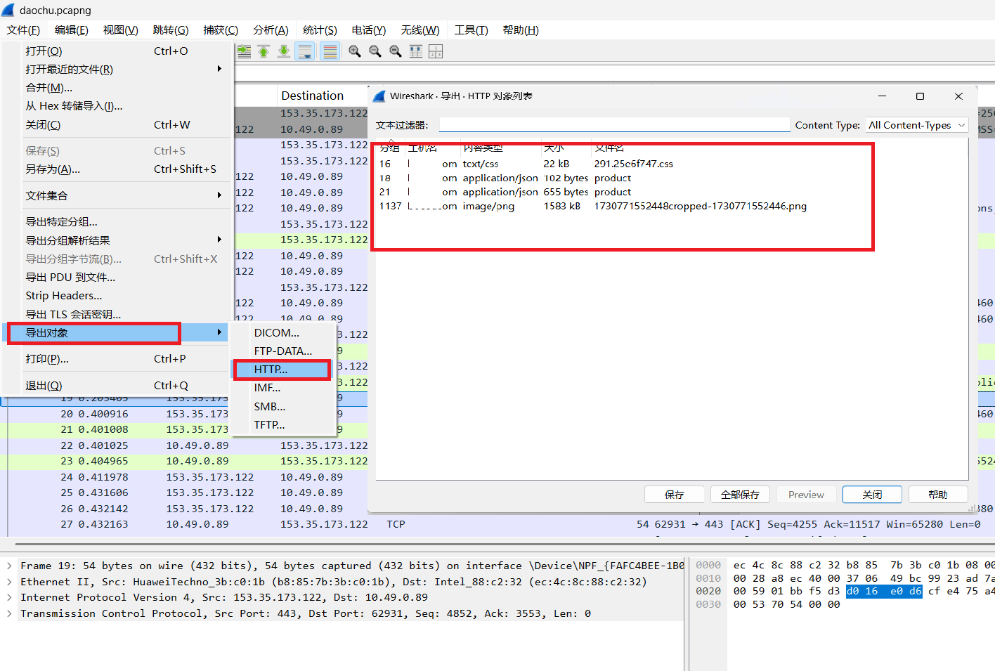 Media Type: image/png)。 - 右键点击,选择 Export Packet Bytes,保存为