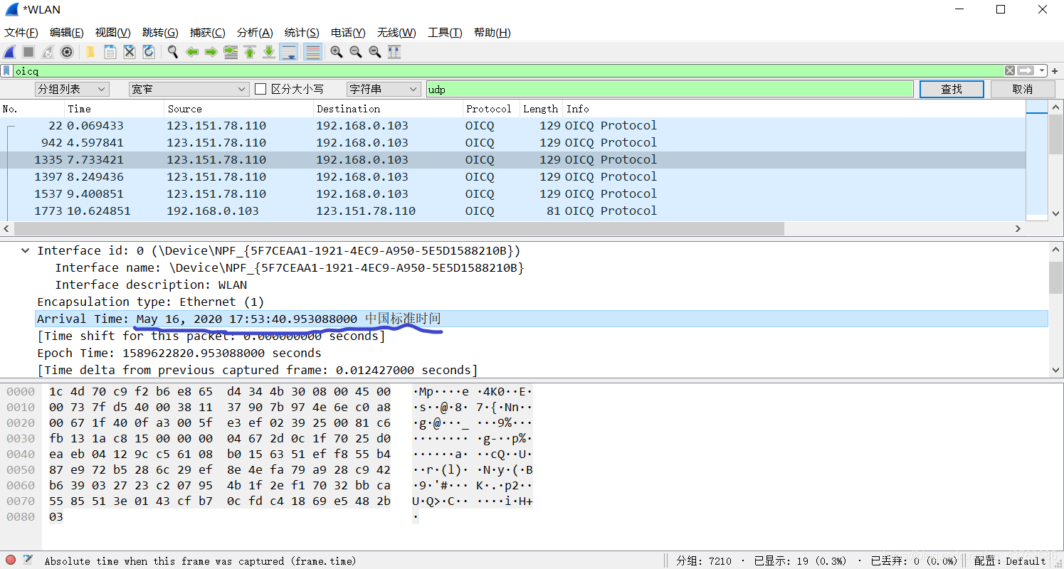 停止抓包:点击左上角的正方形角标,停止抓包。在应用显示过滤器中输入 oicq,然后按下 Enter,即可显示 QQ 数据包。