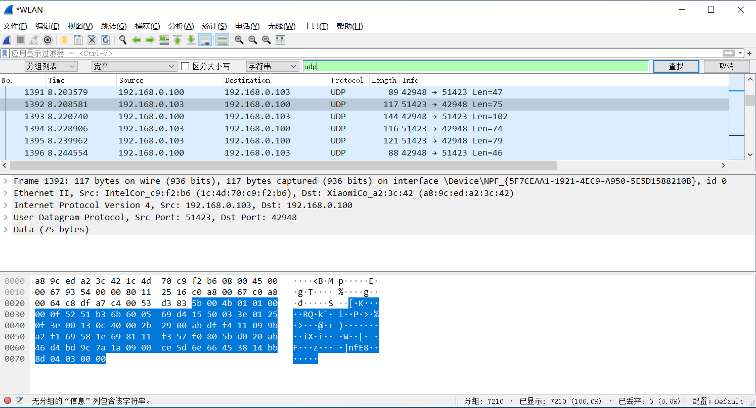 语音通话数据包:使用电脑登录大号,与手机的小号进行语音通话,抓取的 UDP 包可以显示手机的 IP 地址。