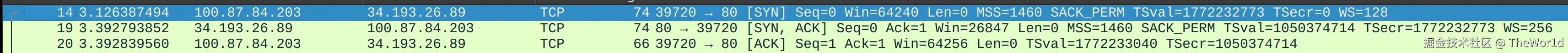 - Win=64256:窗口比第一次多了 16 字节,其实是 TCP 协议栈把“SYN 占 1 字节”解掉后重新算了一次,无实质含义。