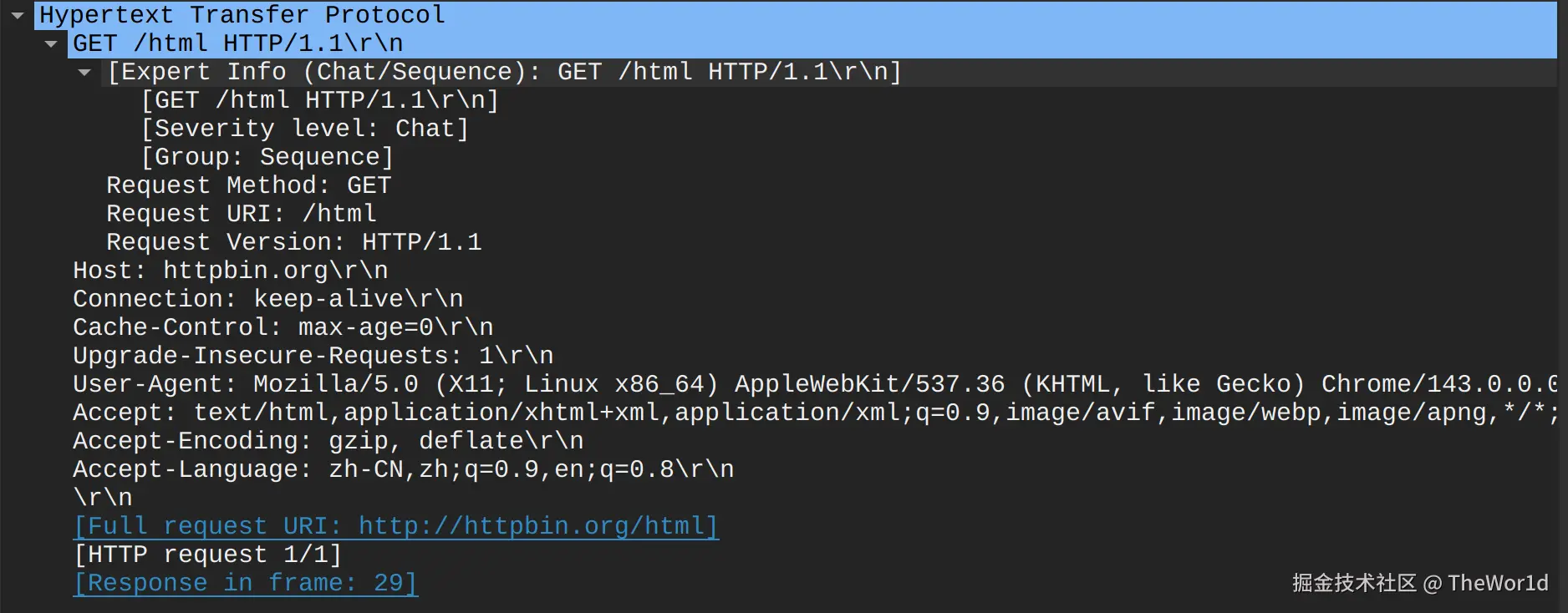 http://httpbin.org/html - 停止抓包,过滤: http and ip.addr == httpbin.org 的ip地址 and ip.addr == 你主机ip地址
