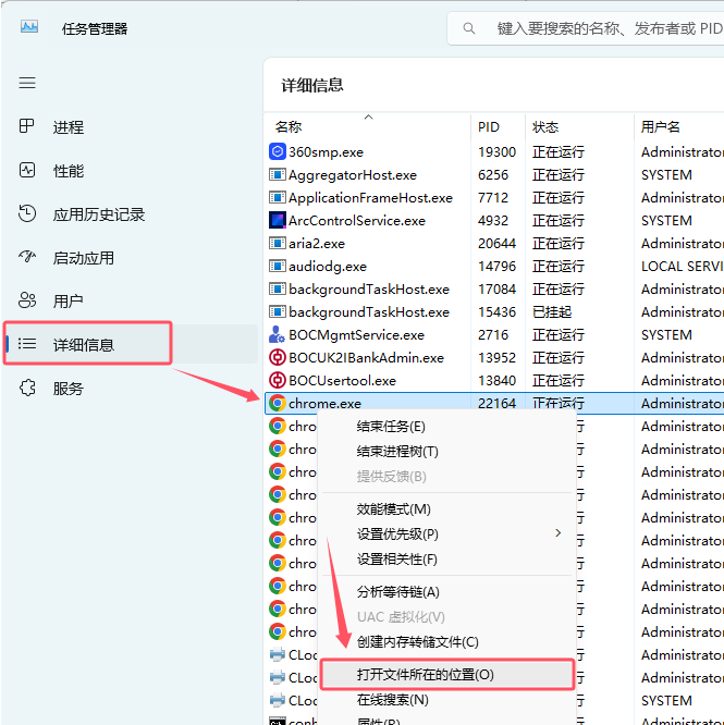 选中“详细信息”,找到谷歌浏览器进程:chrome.exe,点击鼠标右键,在弹出菜单中选择“打开文件所在的位置”: