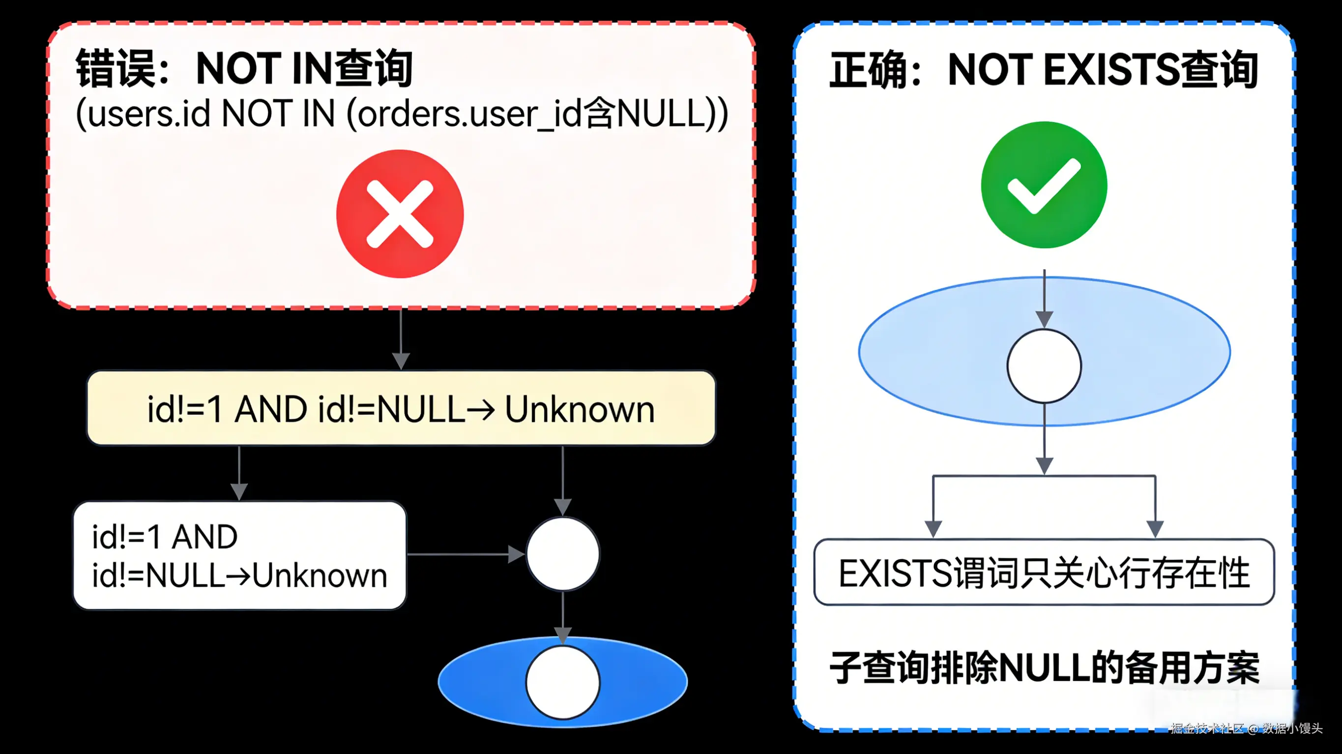 由于最终结果不是 True,该行被过滤。只要子查询中包含任何一个 NULL 值,整个 NOT IN 查询就会彻底失效,返回空结果。 ✅ 正确解法:使用 NOT EXISTS EXISTS 谓词只关心“有没有行”,它不受 NULL 的三值逻辑影响。 或者,如果你非要用 NOT IN,必须在子查询中显式排除 NULL: 但从性能和语义稳健性角度,推荐始终使用 NOT EXISTS。