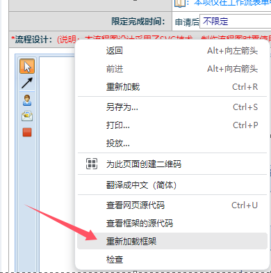 :用谷歌浏览器打开流程设计还是没有显示,要如何解决?![]() 可能是工作流流程太复杂、网速太慢等原因,导致未成功加载工作流流程。 解决方法: 在流程设计页面,点击鼠标右键,选择“重新加载框架”,按道理点击后就会看到完整的正常流程图了: ![]() 如果反复多次点击了重新加载框架,还是无法显示流程图,那就是流程图代码损坏了,只能作废当前有问题的流程,重新设计。