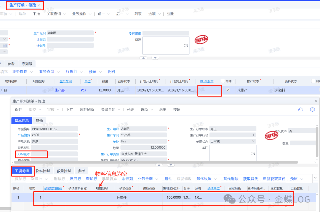 如果【生产订单】没有填BOM版本的话,生成出来的【生产用料清单】子项页签数据便为空,但工单是可以正常保存开工的;如果用料清单数据为空,下推领料单的时候就不会有物料。所以为空时要确认下是不是【物料清单】没建好。
