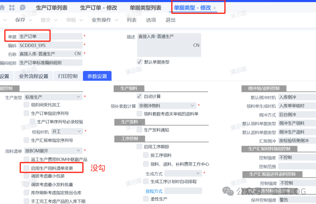 我们可以打开【生产订单】对应的【单据类型】,看下是否有勾选【启用生产用料清单变更】,没有勾则说明没启用。