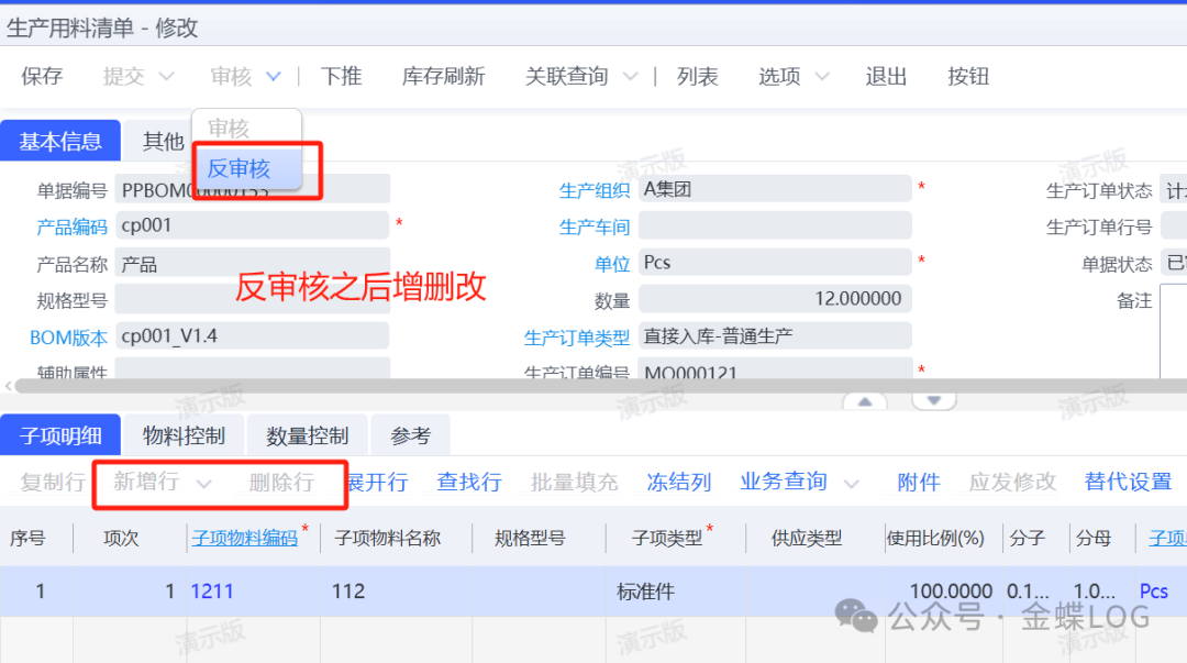 在没启用的情况下,如果中途有增删改物料,PMC可以直接反审核【生产用料清单】进行修改。
