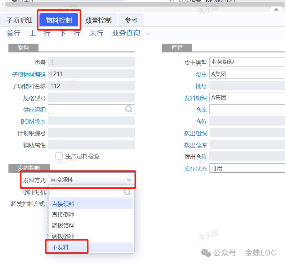 当然从BOM携带过来的物料是不可以删除的,如果这些物料不想发料,可以修改【发料方式】为“不发料”或【分子】改为0。