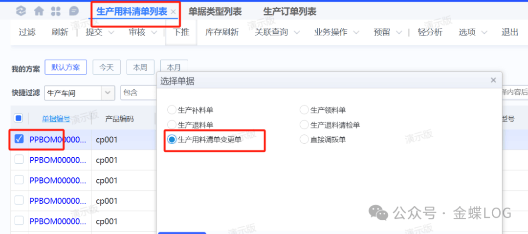 在启用变更流程之后,要进行增删改用料清单数据时,首先找到对应的【生产用料清单】单据,勾选要变更的物料,下推【生产用料清单变更单】。