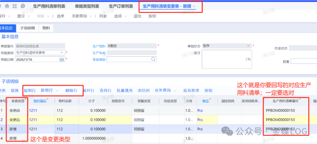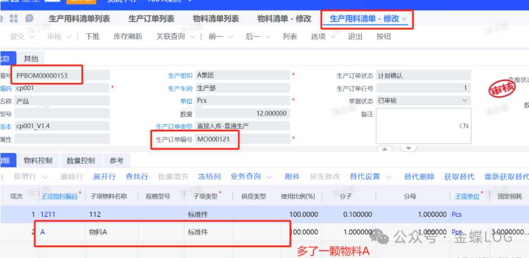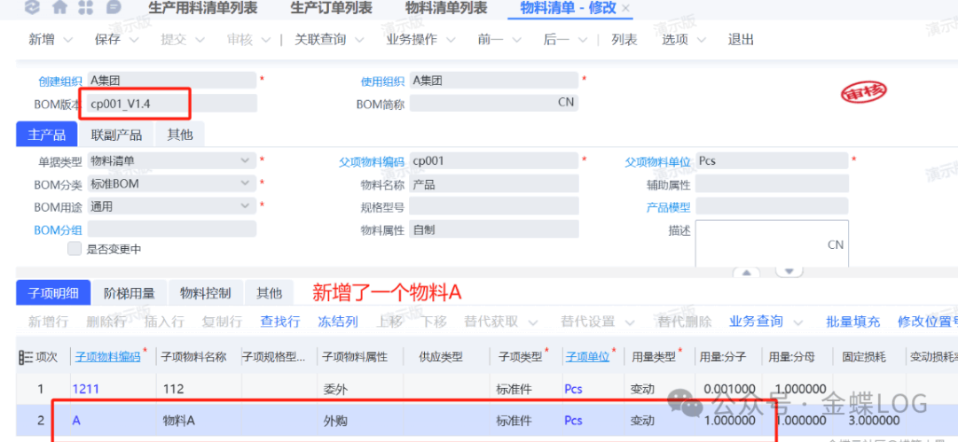 注意:变更单一旦审核之后就不允许再删除,所以确认好修改的数据无误再进行审核;如果变更单要修改分子,要在保存之后字段才可编辑。 工单还在【计划】或者【计划确认】状态时,如果不想反审核【生产用料清单】进行修改;可以先通知工程将【物料清单】更正,然后通过同步订单按钮进行更新。 比如这里给【物料清单】新增了一个物料A;