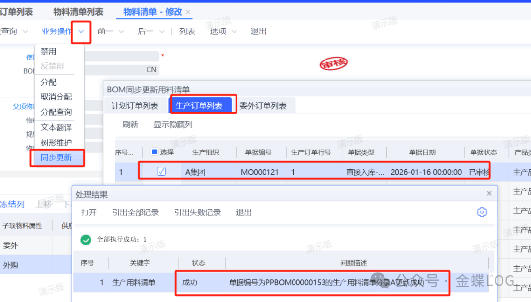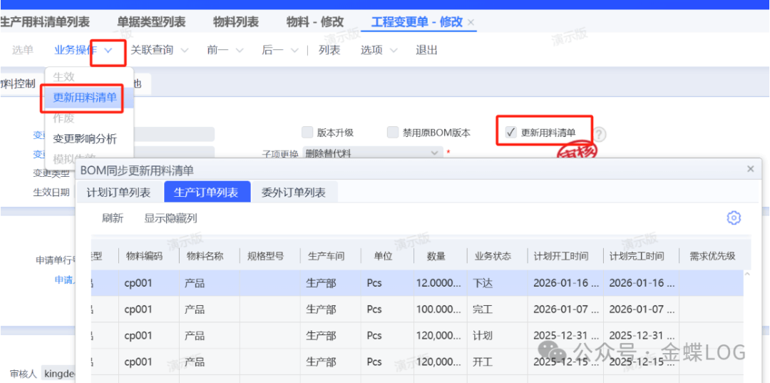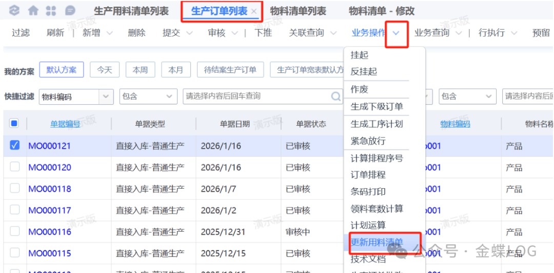 在【生产订单列表】-【业务操作】按钮里面,也有一个【更新用料清单】按钮,跟上面讲的【物料清单】同步按钮功能是一样的,只是操作界面不一样;因为有些公司在工程改完BOM之后,会通知PMC重新下单更新一下投料,那么通过这个按钮,PMC可以不删工单情况下将工程修改内容同步到工单,当然前提工单的业务状态要是【计划】或【计划确认】。