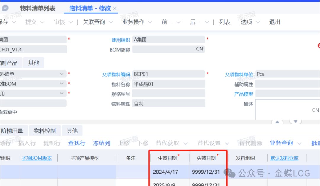 这里在修改【物料清单】的时候,要留意一下【生效日期】和【失效日期】字段,工单的日期要在此范围内,不在的话会同步失败(当然失败还有其他的原因)