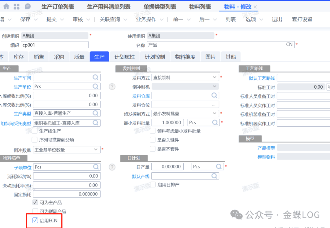公司产品料号勾选了【启用ECN】,此时的BOM修改只能通过【工程变更单】进行。