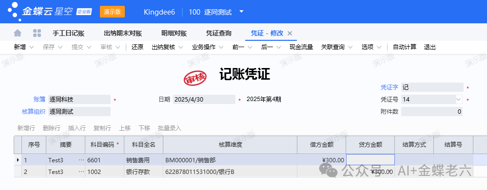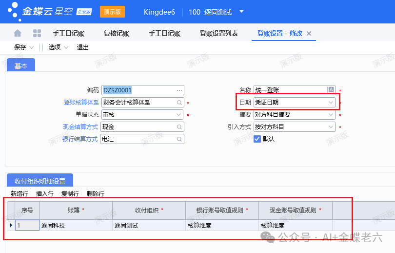 2.登账设置:按核算维度的设置,注意登账设置的日期为凭证日期: