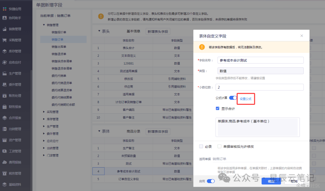 【解释说明】 (1)单据中自定义字段不支持参与单据里已存在的核算逻辑关系,比如在销售订单中新增一个“批发价”的字段,类型为“数值”,在编辑销售订单时这个“批发价”与销售订单中的数量、价税合计等字段没有计算关系,不会参与其他字段的核算。 (2)单据自定义字段最多支持新增20个。 3、单据表体新增自定义字段怎么设置公式? 【解决方案】 首先字段类型必须是数值型,然后点击设置公式,公式里面只能取到数值型的字段(自定义字段如果是数值型的也可以取到)