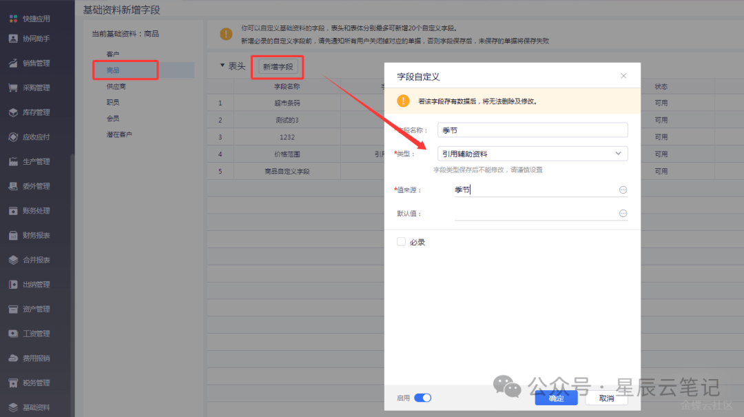 7、为什么自定义字段选择“引用辅助资料”后,“值来源”里没有可选项?它的作用是什么? 【解决方案】 “引用辅助资料”里的“值来源”是引用的《辅助资料》里由用户手工添加的分类,不包括系统内置的分类。 “引用辅助资料”用于处理需要下拉选择某些指定项目的场景,在实际应用中,用户可根据需要来设置。 比如服装行业一般会区分商品的季节,若要在商品中展现 (1)需要先在辅助资料中,新增“季节”的分类,然后在这个类别下面,建立具体的项目,如春季、夏季、秋季、冬季。