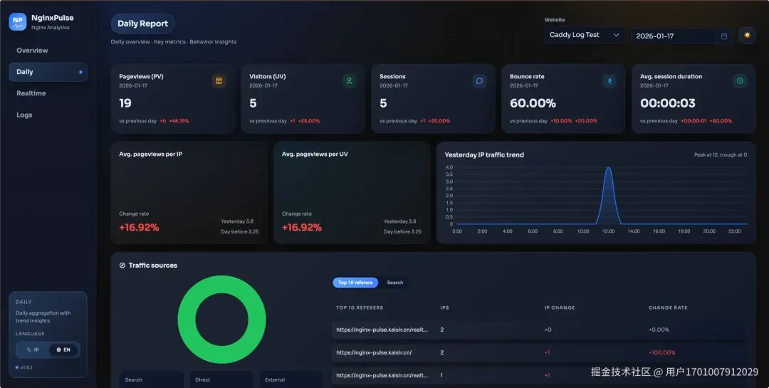 之前试过 GoAccess、ELK 那一套,要么配置麻烦,要么太重量级。最近发现了一个叫 NginxPulse 的项目,用下来感觉还不错,分享给大家。