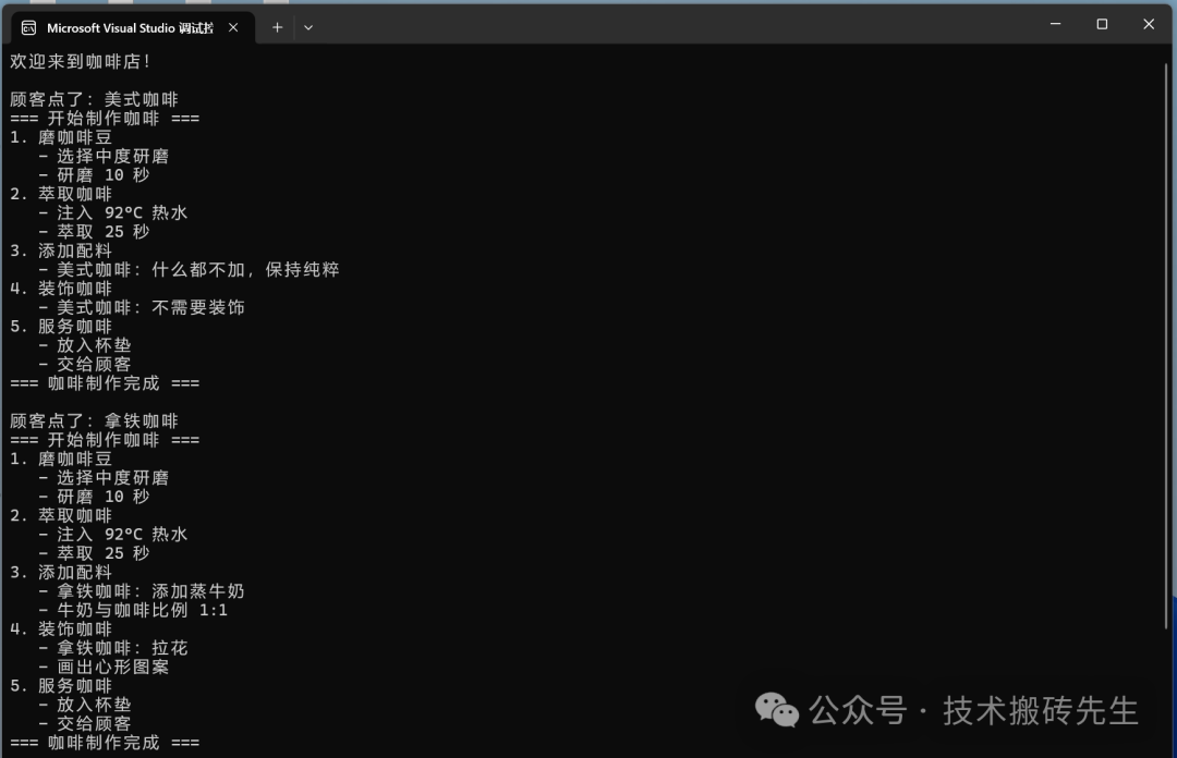 想象一下,你在咖啡店打工,每天要做美式、拿铁、卡布奇诺等不同咖啡。虽然种类不同,但制作流程相似:磨豆 → 萃取 → 添加配料 → 装饰 → 交给顾客。