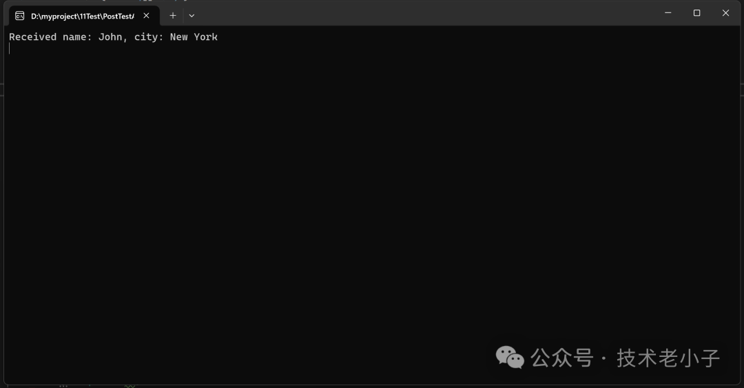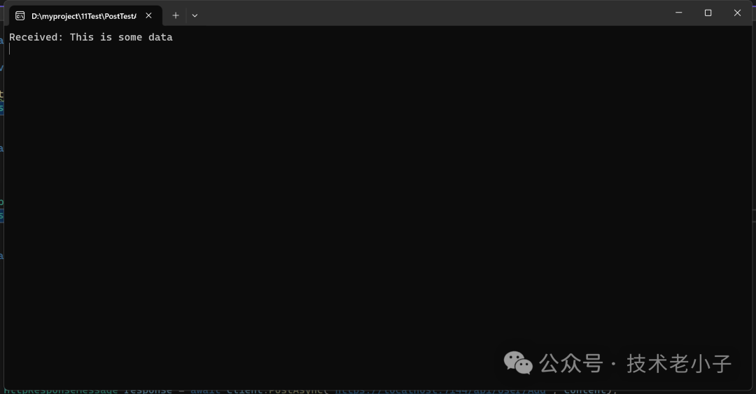 RestClient client = new RestClient();User user = new User();user.name = "张三";user.city = "北京";string jsonData = System.Text.Json.JsonSerializer.Serialize(user);string ret = await client.PostDataAsync("https://localhost:7144/api/User/Add",jsonData);Console.WriteLine(ret);