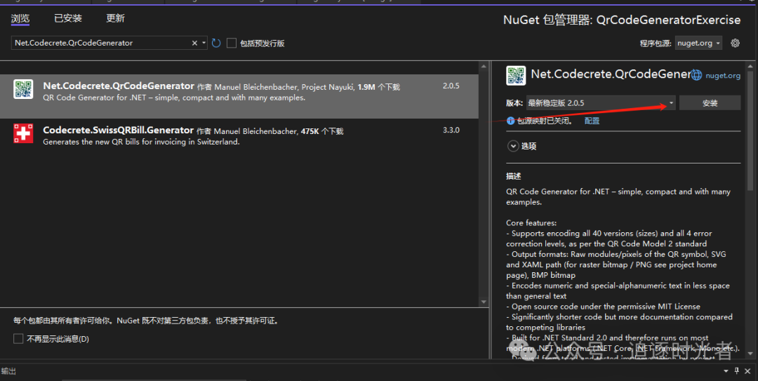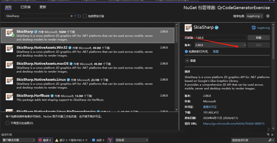 在NuGet中搜索:Net.Codecrete.QrCodeGenerator 和SkiaSharp 类库安装。