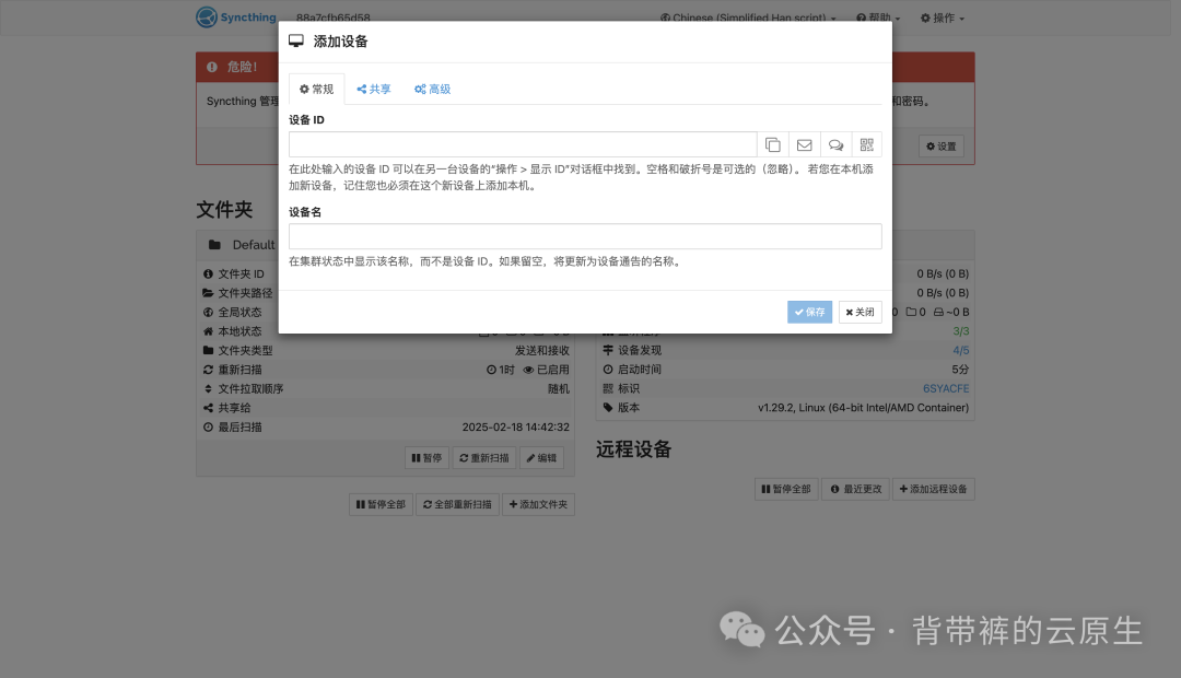 访问 http://<host_ip>:8384,按裸机部署方式配置同步文件夹和添加设备。