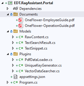 在Plugins目录下放了一些公用的帮助类,如PdfDataLoader可以实现PDF文件的读取和导入向量数据库,VectorDataSearcher可以实现根据用户的query搜索向量数据库获取TopN个近似文档,而UniqueKeyGenerator则用来生成唯一的ID Key。