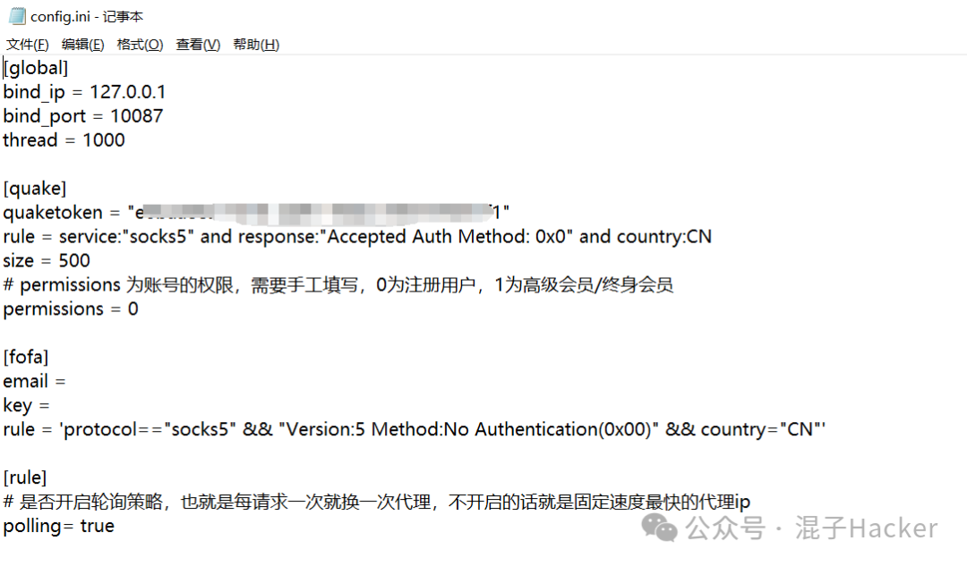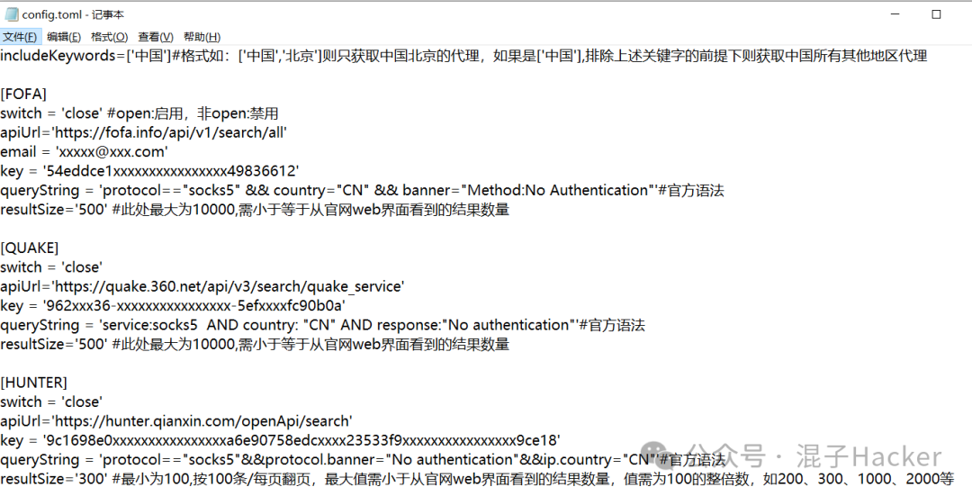 打开config.ini,配置fofa或quake的api信息,没有的可以不配置指定对应的代理IP文件即可
