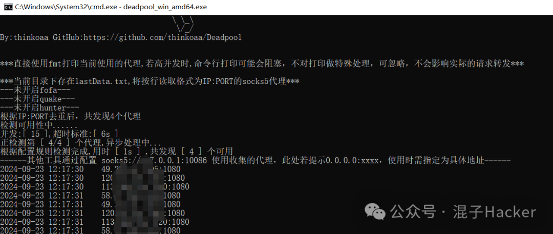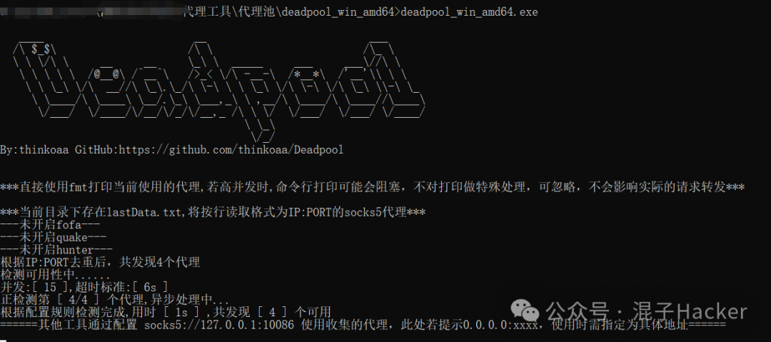 Deadpool代理池工具,可从hunter、quake、fofa等网络空间测绘平台取高质量socks5代理,或本地导入socks5代理,轮询使用代理进行流量转发。我是强烈推荐这款工具的,支持的数据来源比较多不仅支持测绘平台还支持直接从文件导入,解决了没有会员的烦恼。