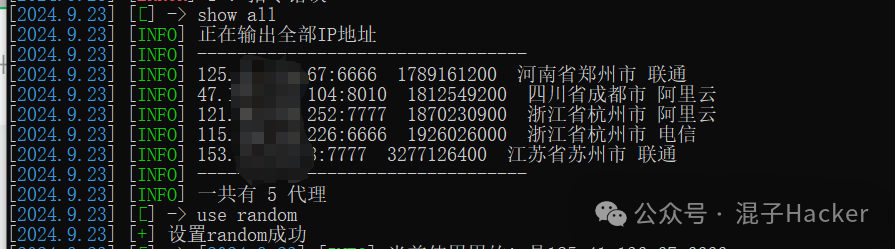 交互式命令:  show all       // 显示全部可用的代理  show ip         // 显示当前使用的代理IP  use ip:port    // 使用ip:port作为当前代理IP  use random     // 恢复默认的代理IP  exit           // 退出程序